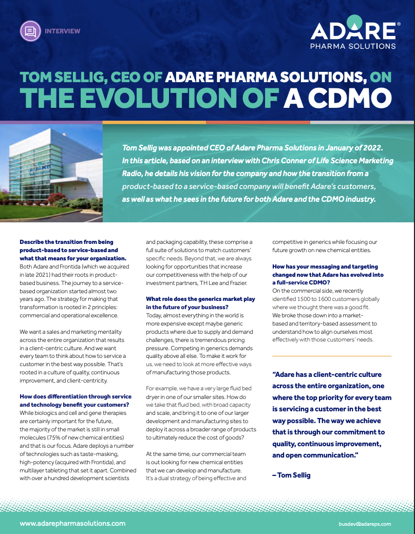 As the CDMO industry shifts toward more integrated, service-driven models, Adare Pharma Solutions is evolving alongside it. In this interview, CEO Tom Sellig outlines the company’s transformation into a full-service partner, emphasizing commercial and operational excellence, stronger customer alignment, and a more strategic approach to market engagement.